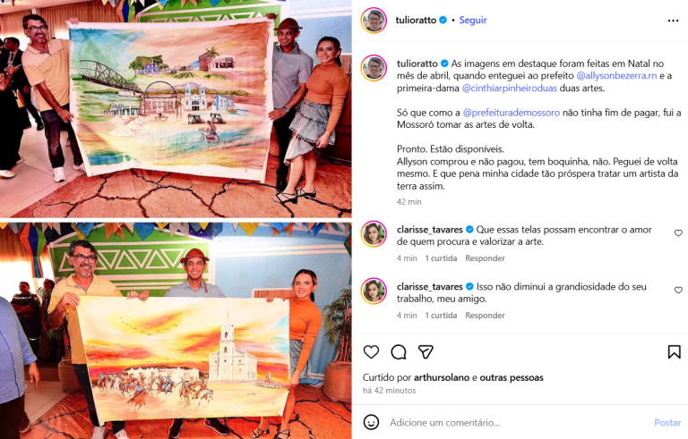 O prefeito Alysson Bezerra não pagou duas telas adquiridas do artista plástico mossoroense Túlio Ratto. O calote foi denunciado pelo próprio artista em suas redes sociais, que precisou ir até Mossoró para recuperar as obras. “Fui a Mossoró tomar as artes de volta. É uma pena minha cidade, tão próspera, tratar um artista da terra … Continue lendo Alysson Bezerra deu um “xexo”em artista de Mossoró