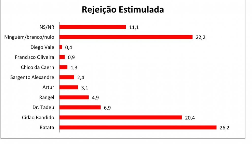 Quando indagados em qual candidato não votaria de jeito nenhum para prefeito de Caicó, o atual gestor Batata (MDB) lidera o quesito com 26,2%. O folclórico Cição Bandido (PTB), que já foi candidato a deputado e perdeu em 2016 para vereador, também teve 20,4% de rejeição dos caicoenses. Dr. Tadeu aparece com 6,9%, Rangel com 4,9%, Arthur Maynard teve 3,1%, Sagento Alexandre do PSL com 2,4%, enquanto Chico da Caern 1,3%, Francisco Oliveira, 0,9% e Diego Vale 0,4% foram os menos rejeitados. Confira o gráfico da Seta: