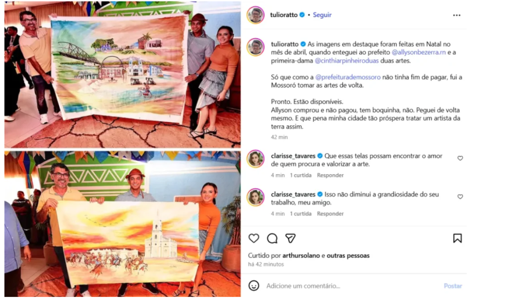 Casos semelhantes já ocorreram no estado, como a denúncia feita pelo artista plástico Túlio Ratto, de Mossoró, que cobrou publicamente pagamentos por obras adquiridas pela prefeitura local. Situações como essa reforçam que atrasos existem, mas também levantam o debate sobre a forma e o momento em que essas cobranças vêm à tona.