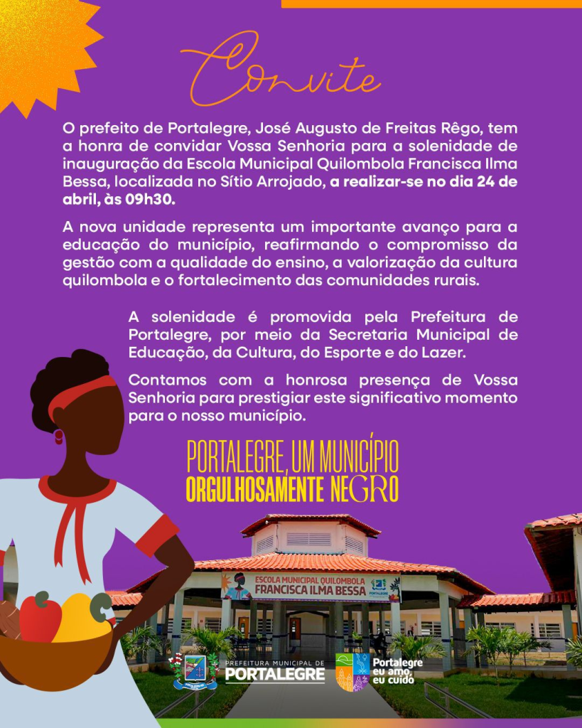 A gestão do prefeito de Portalegre, José Augusto, que também é o presidente da FEMURN, realiza nesta sexta-feira (24), às 9h30, a inauguração da Escola Municipal Quilombola Francisca Ilma Bessa, localizada no Sítio Arrojado. A obra é considerada um marco histórico para o município e para o Rio Grande do Norte, sendo a primeira escola quilombola do estado.