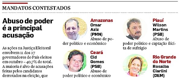 Dos 27 governadores eleitos em 2010, 11 respondem a processos no STF. A maioria dos casos envolvem abuso de poder econômico.